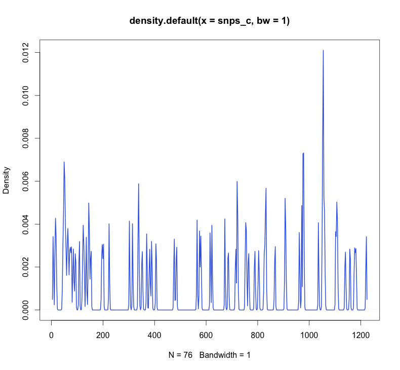 While the outbreak analysis stuff later in the tutorial was cool, I also found the basic data exploration steps very interesting. The first thing we did was load in a sequence alignment and examine the distribution of SNPs along the length of the sequence. I thought this could be useful for a problem I have had previously – i.e. identifying characteristic SNPs between groups of sequences (e.g. toxin subtypes).