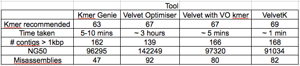 “As expected velvet optimiser gave a much better NG50 – although, as a side note, it is hard to imagine how a difference in the k-mer of 2 from VelvetK resulted in such a dramatic difference in NG50.”