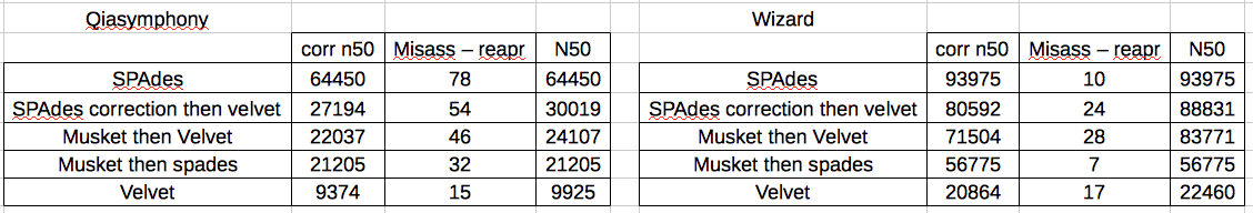 For the Qiasymphony data, the approach that gave by far the best results was SPAdes, with SPAdes-Velvet, Musk-Velv and Musk-SPA all significantly worse and much of a muchness. Every method including error correction significantly improved on pure Velvet. To me, this indicates that the problem with the Qiasymphony data is a combination of something amiss with the insert size distribution and an error profile that is corrected by BayesHammer but not Musket.