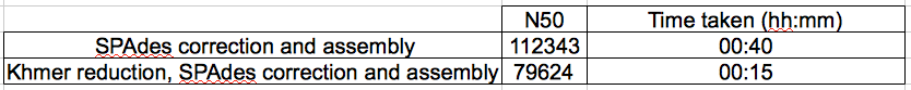 Table 1: Impact of Khmer reduction on N50 and time to assemble of SPAdes