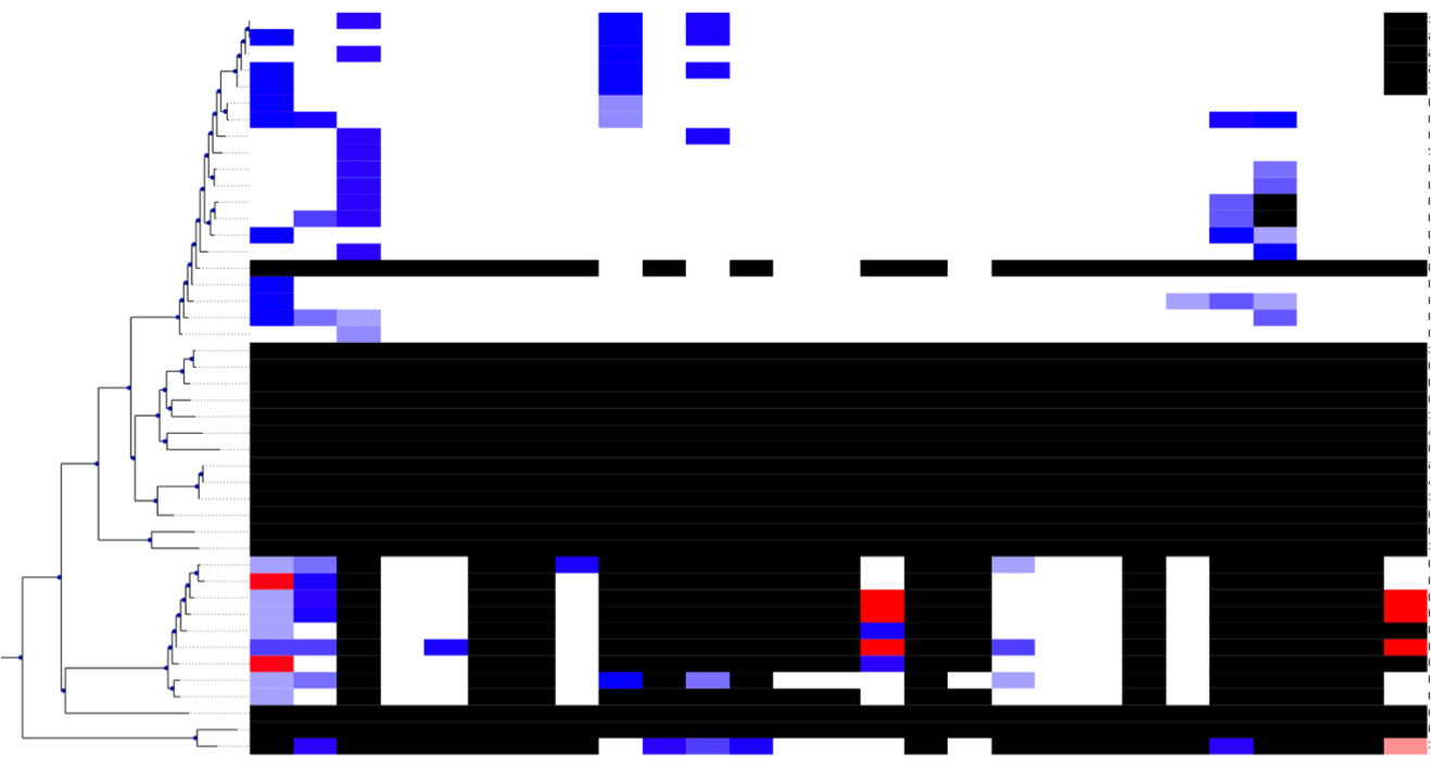 Then, hopefully, when you run Alex’s script, a GUI will open containing something like the above (white = presence, black = absence, blue-red something in between), with your tree and associated features of interest. Hooray!